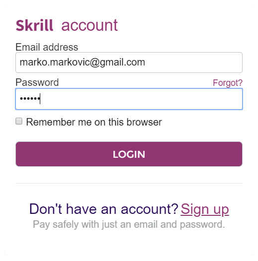 Kada potvrdite iznos, otvoriće se prozor u kojem je potrebno unijeti podatke Vašeg SKRILL naloga i tako pristupiti plaćanju.
